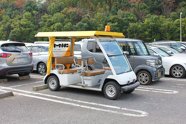 駐車位置が事務所から遠い位置の場合は、出来る限り、ヤマハ・カートでご案内いたします。雨が強い時は、スズキ・パレットが活躍します。